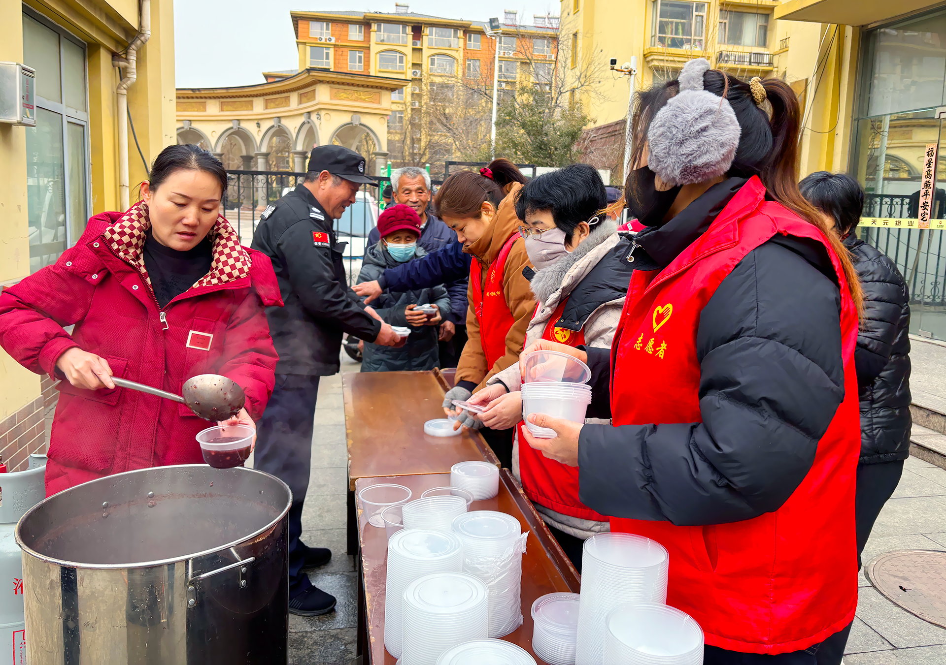 社区工作人员与志愿者们早早架锅熬粥,红枣、花生、桂圆在锅中翻腾,粥香四溢。银发长辈围坐话家常,外卖骑手、快递小哥也暂歇脚步,接过热粥感受社区关怀。